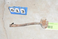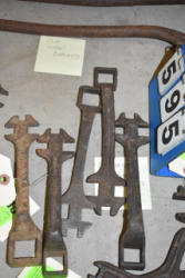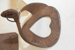 Lot of 3 10" large cast iron hooks, 1 5" hook, 1 4" hook and 1 old cow bell