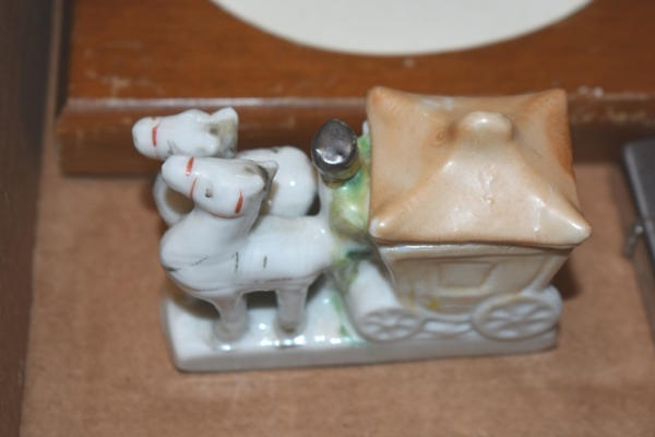 Box lot of knick knacks including horse and carriages in plastic and ceramic