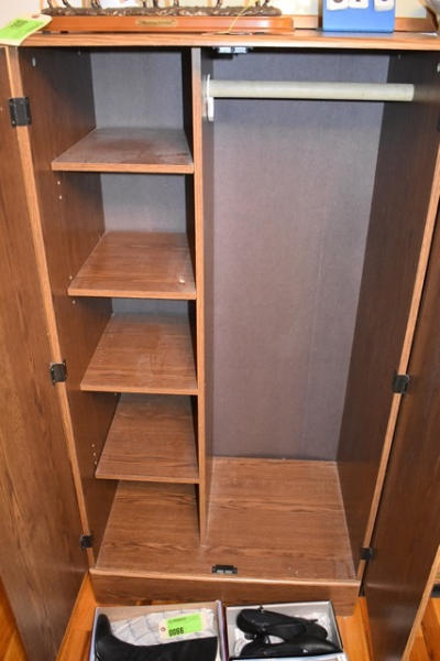 2-door cabinet, 32" wide x 60" tall, wardrobe style with shelving on one side and clothing rod on other side