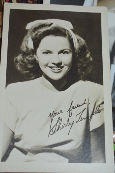 Lot of vintage prints, "The Children's Party Book", assorted cards (some autographed, Shirley Temple post cards, Tatum O'Neil, Judy Garland, Batman and Robin, Liz Taylor), vintage camera