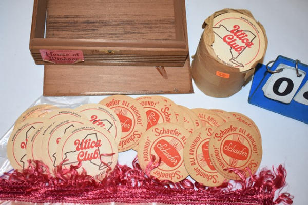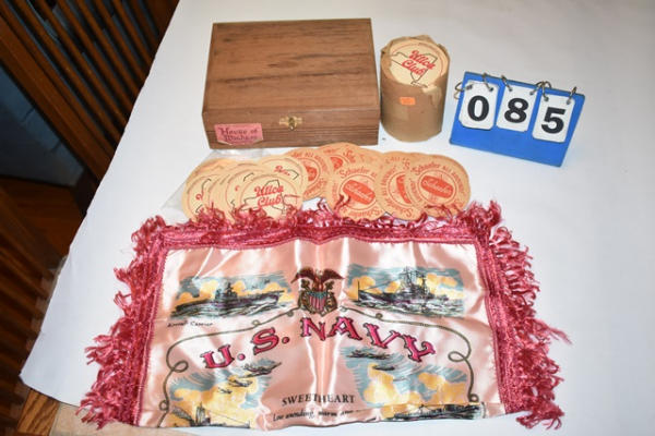 Box lot consisting of assorted vintage beer related coasters and the US Navy Sweetheart, Newport, RI pillow sham