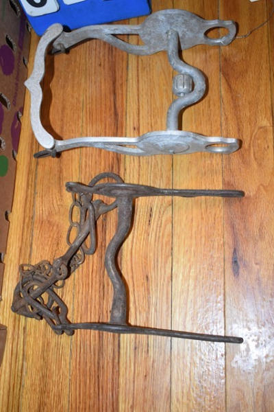 Box lot of assorted bits including Eglentine metal spurs, and a feed bag