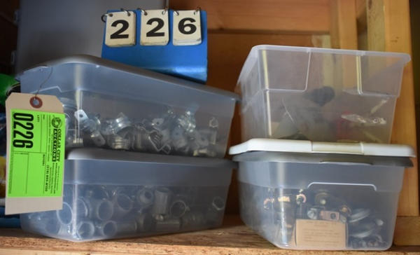 Shelf lot of contents including electrical connectors, conduit strapping, cantles, etc.