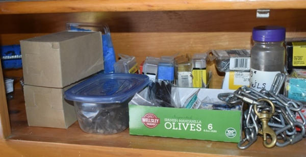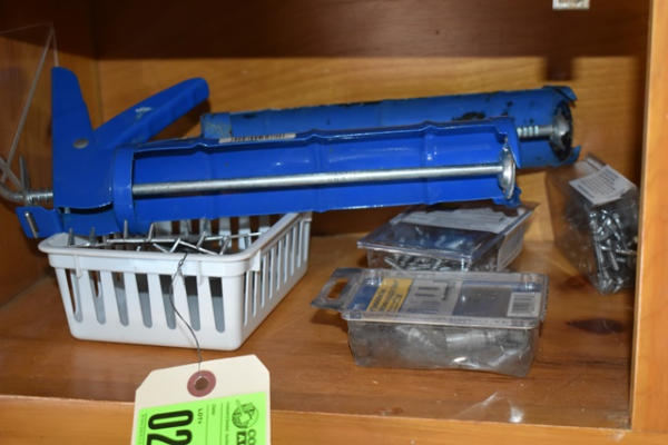 Shelf lot including ear muffs, twin cartridge respirator, Bostitch nails