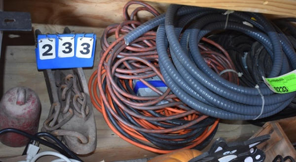 Shelf lot of lead cords, plastic conduit, electrical boxes, weight