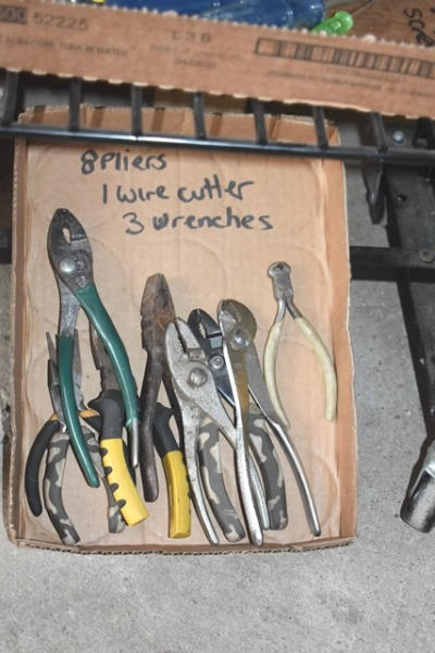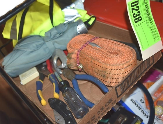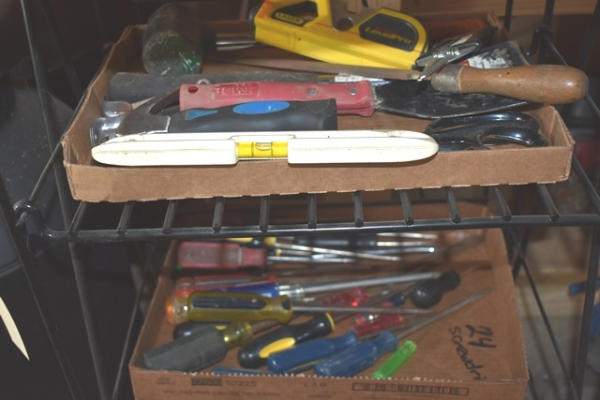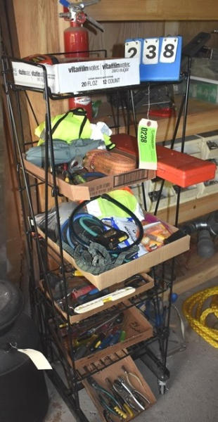 Rack with contents consisting of tools, bungee cords, screwdrivers, scissors, etc.