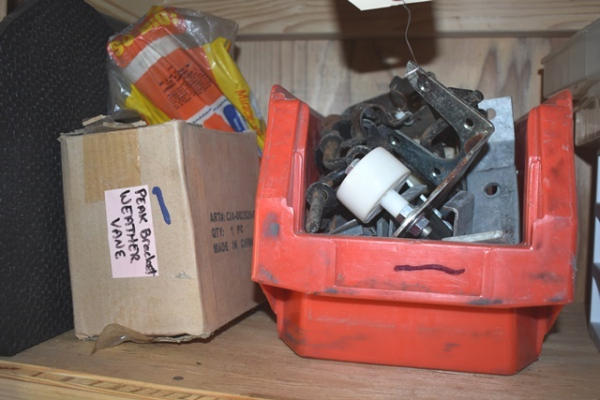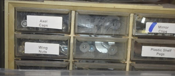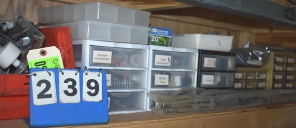 Shelf lot including rubber plastic washers, small nails, bracketry