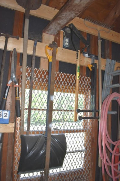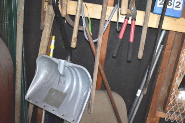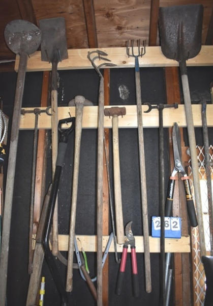 Wall lot of assorted rakes, shovel, loppers, etc.
