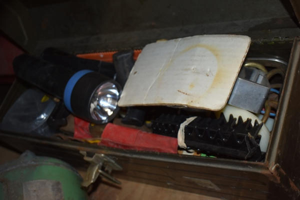 Lot of tools including air compressor, weights, toolbox