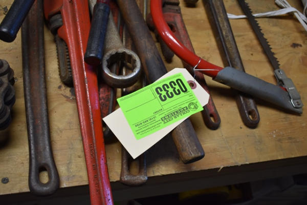 Lot of pipe wrenches, bow saw, bolt cutters, etc.