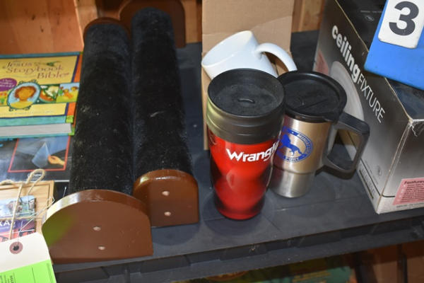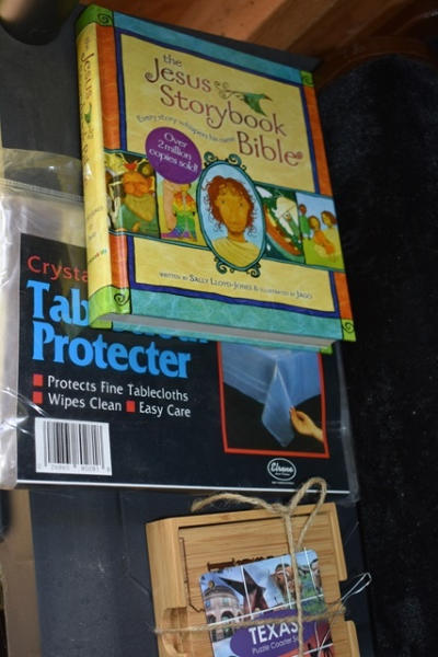 Shelf lot including "Jesus The Story Book Bible", cups, ceiling fixture, etc.