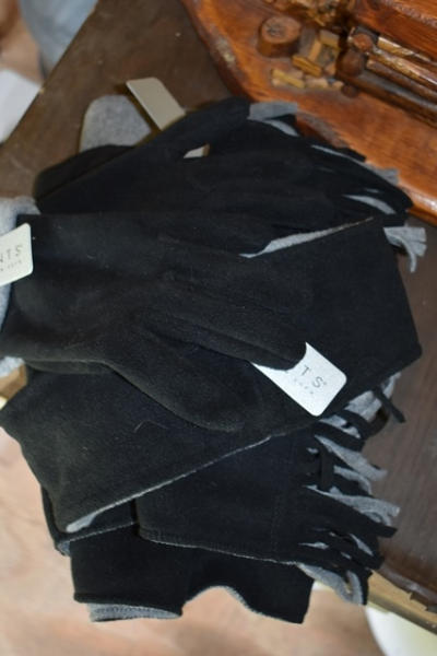 Box lot including gloves, horse thermometer, open house signs, etc.