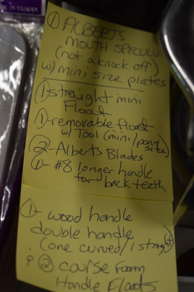 Albert's Mouth Speculum, mini size plates, 1 straight mini float, 1 removable float with tool, mini/pony size, Albert blades, #8 longer handle for back teeth, 1 wooden handle, double handle, 1 curved, 1 straight and 2 course foam handle floats