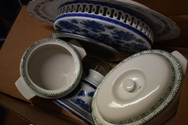 Box lot including cake tray, 2 crock servers, platter by Silver Wreath, Japan, bowl by Maxam, made it Italy, and 1 silver with crystal server dish