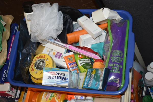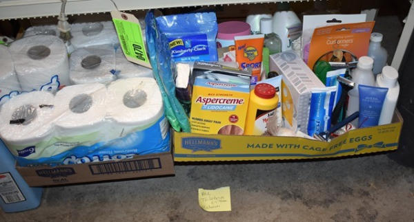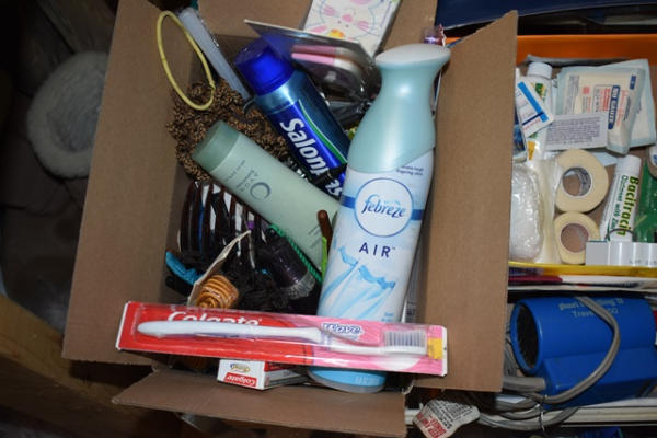Lot of bathroom toiletries including toilet paper, vitamins, air freshener, razors