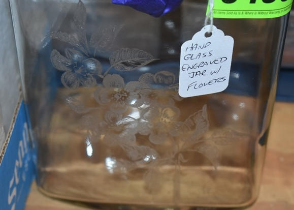 Hand engraved glass jar with flowers
