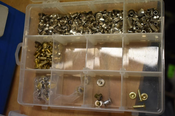 Lot of 2 organizing bins with Chicago screws, grommets, bolts, etc.