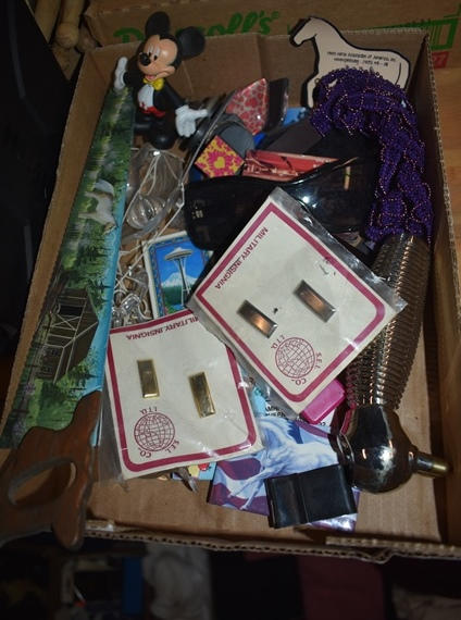 Box lot with windchimes, sunglasses, fridge magnets, and magnetic back massager