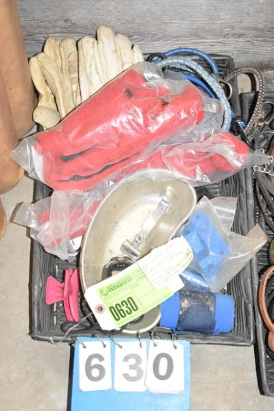 Lot of 2 pairs of leather gloves, 5 bungee cords, stainless steel tray, numbers clip, 4 bucket holders, 1 tail wrap and misc. hooks and snaps