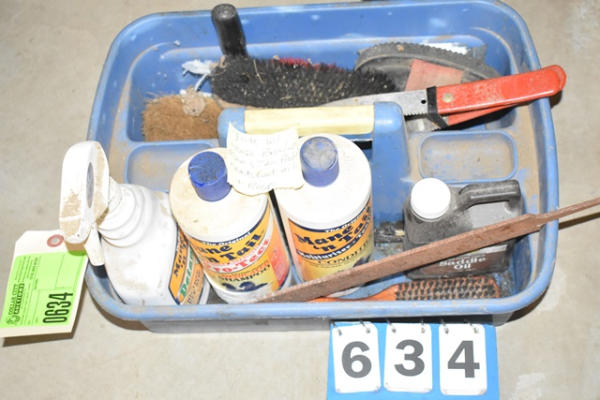 Tote with horse brush, Mane and Tail product, Neatsfoot Oil and rasp