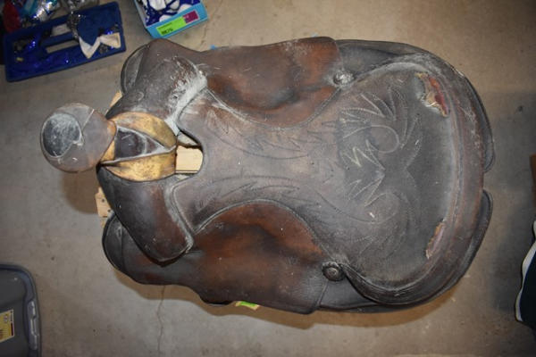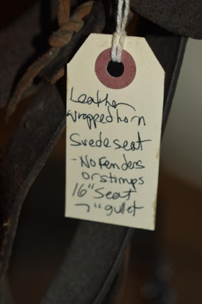 Saddle, leather wrapped horn, suede seat, no fenders or stirrups, 16" seat, 7" gullet