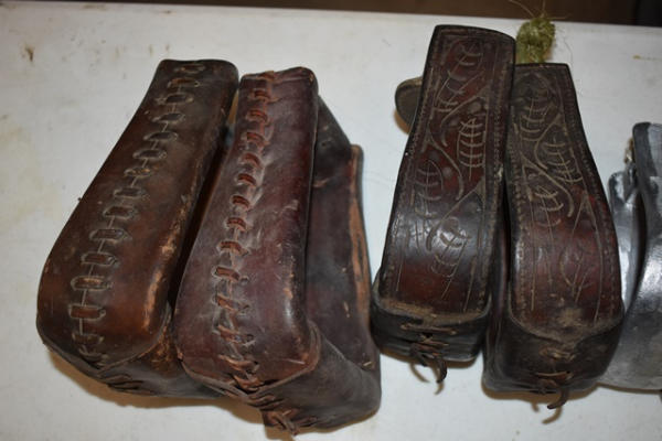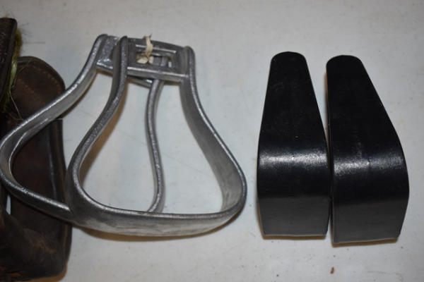 1 pair of brushed aluminum show stirrups and 1 pair tooled leather stirrups, 1 pair of leather stitched and 1 pair of kids plastic stirrups