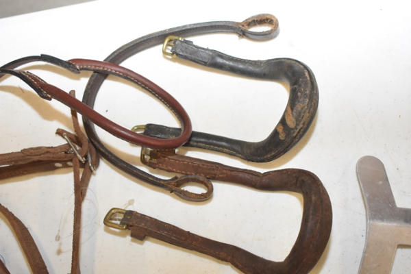 Pony crupper with strap for riding saddle, 1 aluminum saddle attachment, 1 brown brow band, 1 tail crupper with split leather for training surcingle and 2 leather driving cruppers