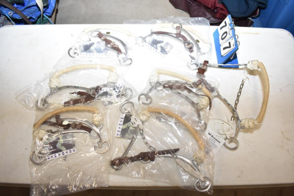 Stainless steel brushed chuck hackamore with rawhide braided rope noseband, 8 1/4" cheeks with silver trim, complete with leather curb connector and dog curve chain for intermediate horse, medium to strong effect