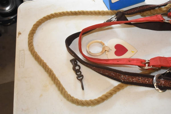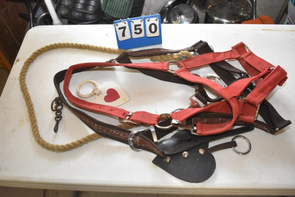 Tack hook with new bling draft halter, 1 red used draft halter and 3 decorative harness fobs