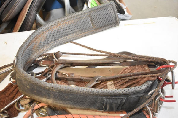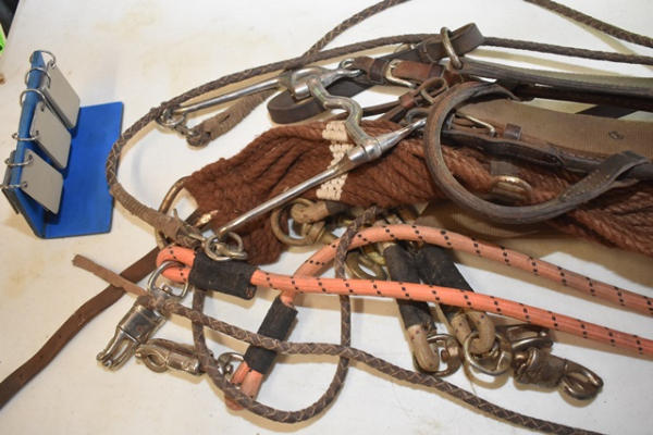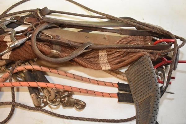 Tack hook lot including plain design breast collars (size 44), Tuffy neoprene western girth, rolled bridle, long shank bit, pair of trailer ties, string girth and off billet