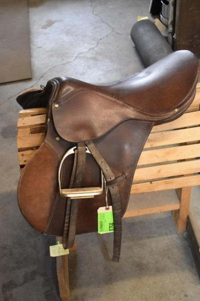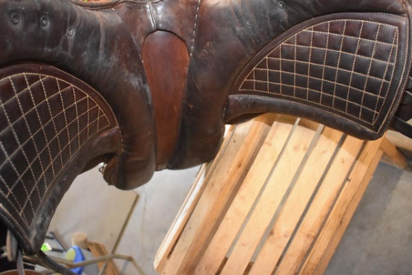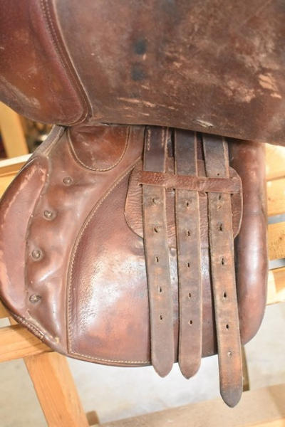 Wide tree, Borelli, Made in Argentina, English saddle, Model 6677, with outside suede knee rolls, inside pencil Rolls, with back leg block, 17"
