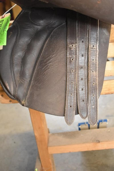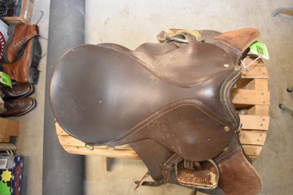 English saddle with outside suede knee rolls, 6" gullet, 17" seat, comes with stirrups