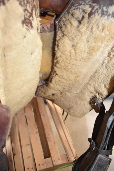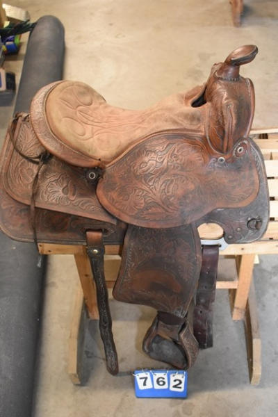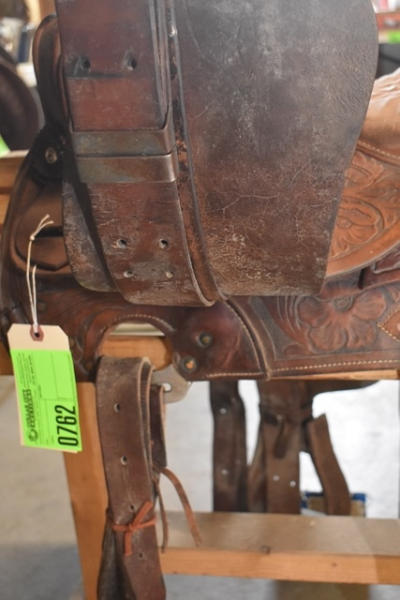 Saddle, Floral tooled with horse head fenders and 15" seat, 7" gullet, includes matching back straps