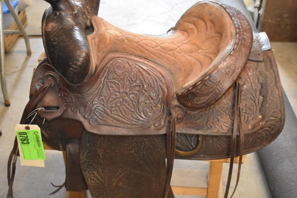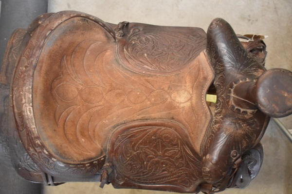 Saddle, 16" tooled suede seat, with horse head and fenders, hard to find matching horse head, stirrups, 7 1/2" gullet and folding saddle rack