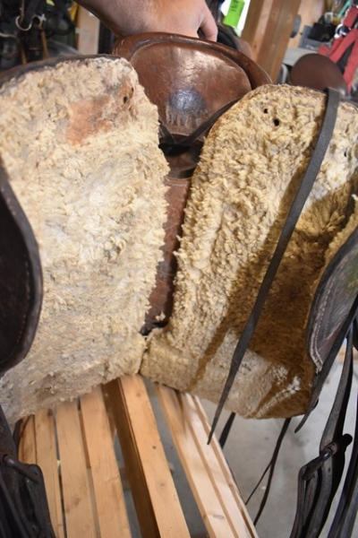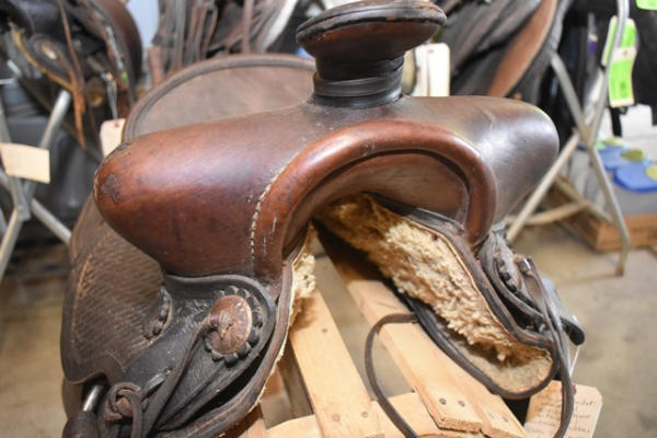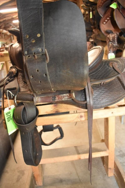 Saddle with antique basketweave double skirted round with fenders and outside leathers, has the antique leather carved stirrups, leather wrapped horn, 13" seat with 6" gullet