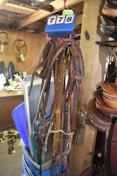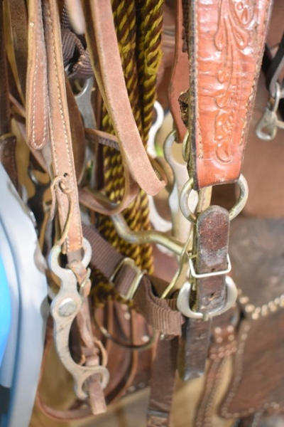 Tack hook lot including fancy tooled breast collars, snap on bit with reins (converts halter to a bridle), leather 1 ear split rein bridle, string girth, 1 ear with aluminum bit, 1 ear with split reins