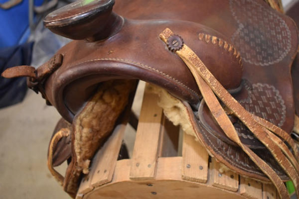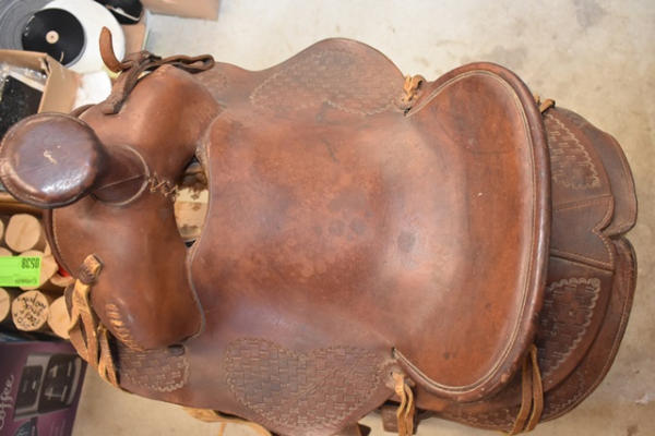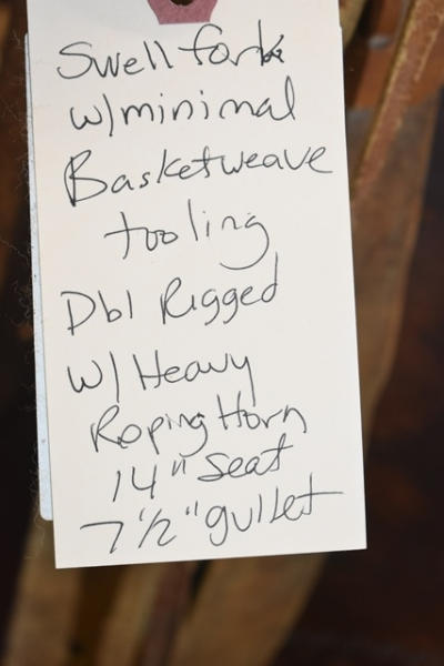 Swell Fork with minimal basket weave tooling, double rig with heavy roping horn, 14" seat, 7 1/2" gullet, roping saddle