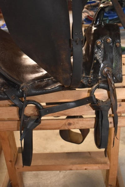 1930 Open gullet, 14" seat, high back spotted saddle, with wide wooden stirrups, double rigged, 5" gullet