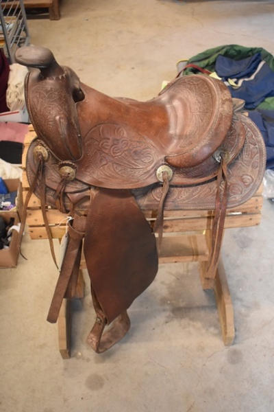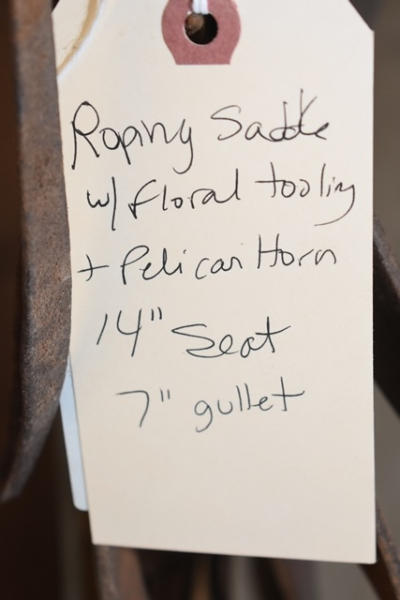 Roping saddle with floral tooling, Pelican horn, 14" seat, 7" gullet