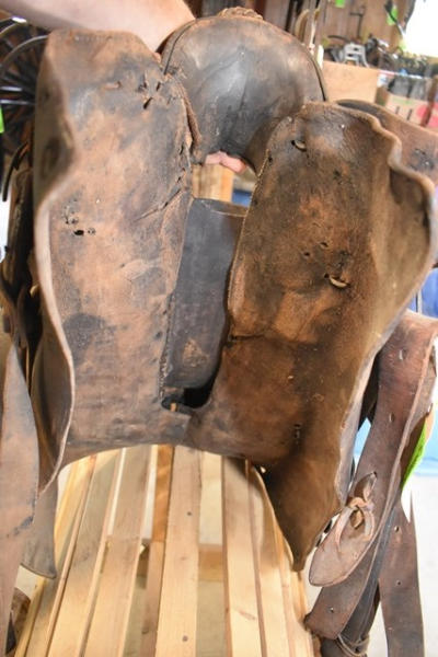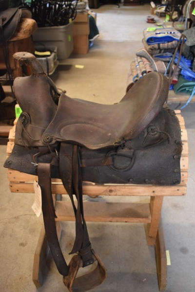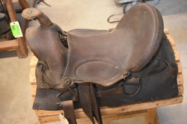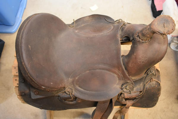 Early 1930 saddle, high back, A fork, double rigged, square skirt, 14" saddle, 4" narrow gullet