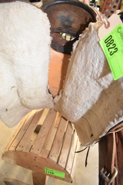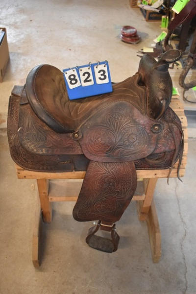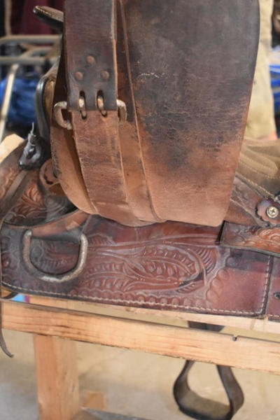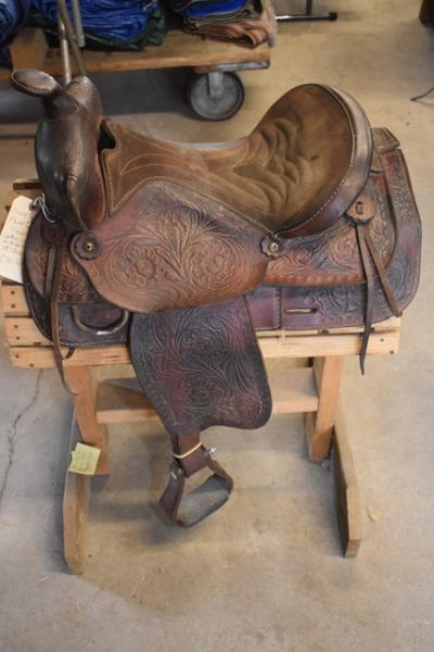 Suede seat, floral tooled saddle, leather slot for back strap, 15" seat, 6" gullet