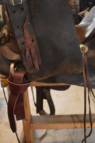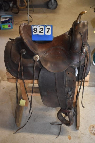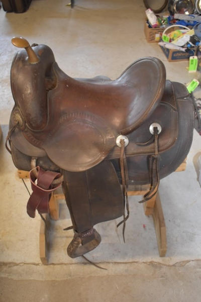 Western Saddle Company, Denver, CO, high back, deep seat with brass horn, 15" seat, 6" gullet, outside stirrup fenders and round stirrups