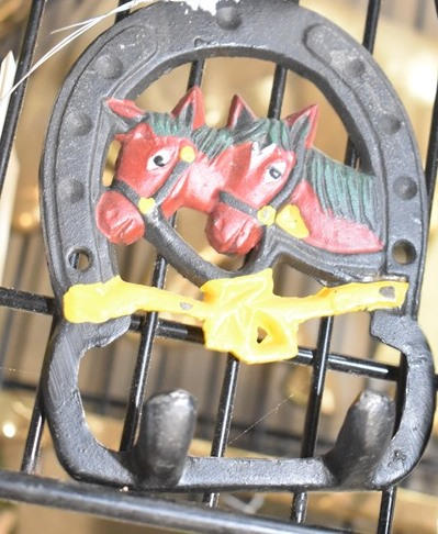 Lot of 2 horse head bridle hooks, 3 misc. horseshoe shaped hooks and 2 cowboy bucking cutouts