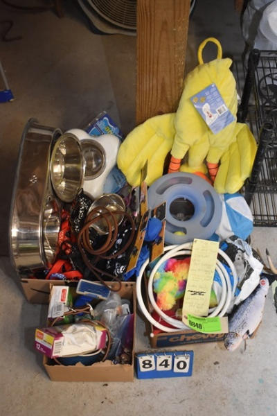 Large lot consisting of food dishes, pet toys, animal costumes, leather leads, cat and dog toys, stainless steel feeding bowls, small fleece pet bed