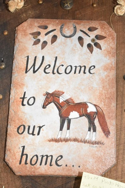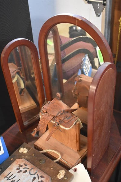 Homemade miniature leather saddle with mirror and a "Welcome to our Home" plaque that is 9 1/2" x 14" (slate)