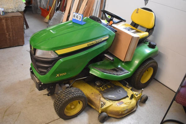 John Deere X320 riding tractor, 54" deck (edge cutting system), 22 HP gas engine, approx. 700 hours, includes 2 keys, manual and a new deck protector, Hydrostatic drive, starts and moves