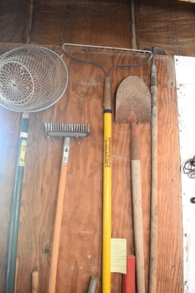 Lot consisting of hoe, rake, wire brush, minnow landing net, shovels, etc.