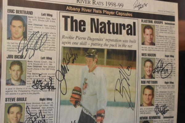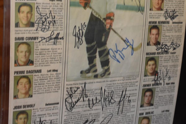 Lot of hockey cards, most from Albany River Rats, early New Jersey Devils Farm Team and others from late 90s. Also includes autographed newspaper with pictures.
