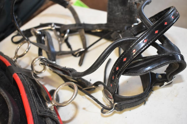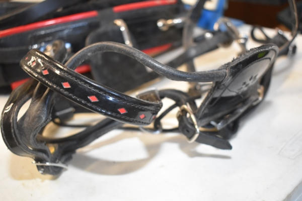 Patent leather show harness with red trim, fits large A or small B mini, 32" - 36", patent leather traces and bits with 2-tone lines, breast collar, breast collar has hold loop for martingale (not included)