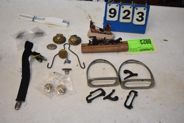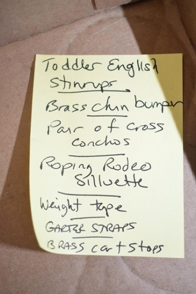 Toddler English stirrups, brass chin bumper, pair of cross conchos, roping rodeo silhouette, weight tape, garder straps, brass cart stops